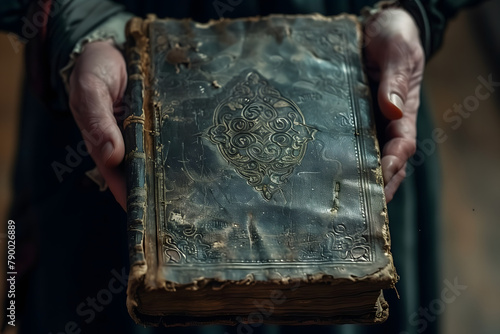 Close-up of two hands holding an ancient, weathered and mysterious book