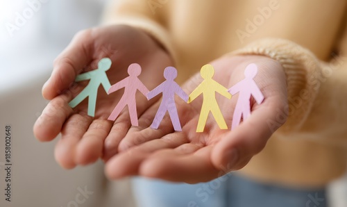 Close-up of two open hands gently holding a chain of colorful paper people figures, symbolizing community, inclusion, connection and support.