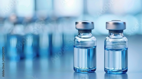 Close-up of two vials filled with clear liquid, placed in a laboratory setting, symbolizing medical research and pharmaceutical industry.