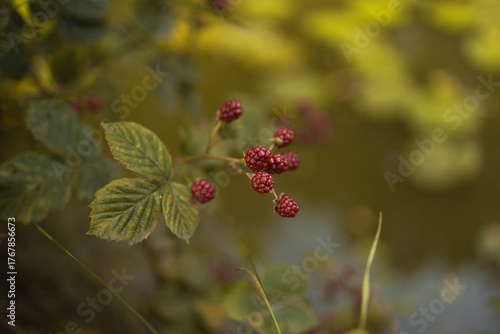Close-up of unripe red blackberries growing on a bush near a pond in soft golden sunlight. Natural summer background with bokeh effect, symbolizing growth, harvest, and wild nature beauty.