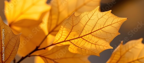 Close-Up of Vibrant Golden Maple Leaves with Intricate Veins Illuminated by Warm Autumn Light for Nature and Seasonal Themes