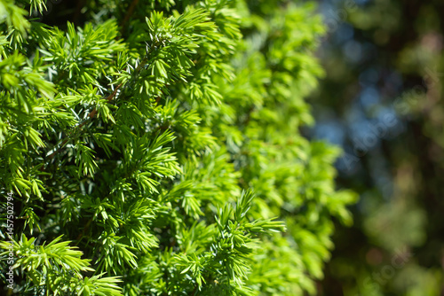 Close-up of vibrant green juniper needles in sunlight. Natural evergreen texture perfect for backgrounds and seasonal designs