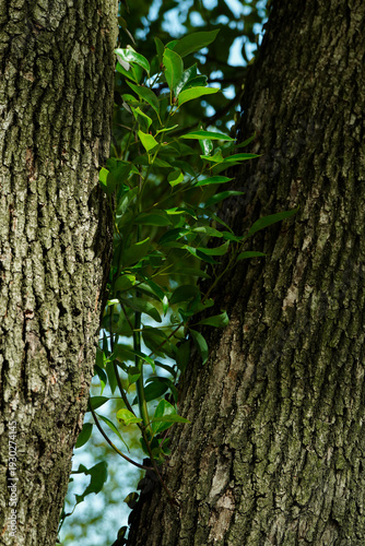 Close-up of vibrant green leaves growing between two thick tree trunks. Concept of new life, growth, and natural resilience in a forest.