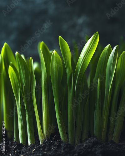 Close-up of vibrant green shoots growing in soil on a blurred dark background
