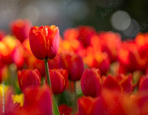 tulip, red, orange, flower, bloom, spring, garden, nature, flower petals, sunlight, sharpened, bokeh, vibrant, colours, macro, beauty, floral, growth, season, detail, fresh, bright, plant, flora, closeup, stem, field, landscape, natural, serene, background, aesthetic, photo