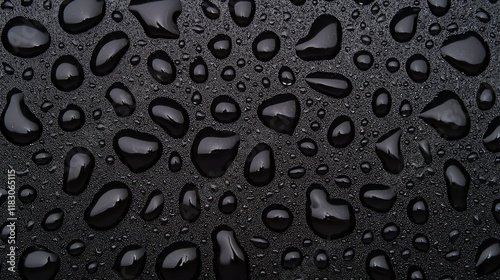Close-up of water droplets on a dark surface, showcasing their shapes and reflections, creating a striking visual effect.