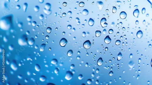 Close-up of water droplets on a smooth glass surface, reflecting soft blue light, hyper-realistic.