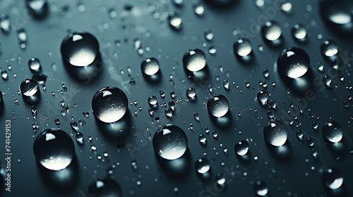 Closeup of water drops sliding on wet surface. Dark black background. Generative AI
