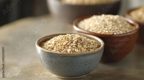 Close-up of whole grains like quinoa, brown rice, and oats in small bowls on a rustic table, with clear focus on textures
