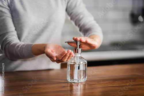 Closeup of woman hands using hand sanitizer liquid for bacteria and virus neutralization. Keep your hands germ-free and virus free with the use of hand sanitizer. Personal Protective Equipment for Inf
