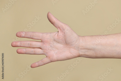 Closeup of woman's hand with aging skin on beige background. Rejuvenation treatment