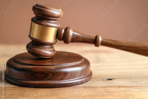Close-up of wooden judge gavel on wooden table. Brown, wooden, hammer-like object, of authority, law, justice. Iconic tool for judges to bang, indicating decision, verdict, agreement. Used in court,