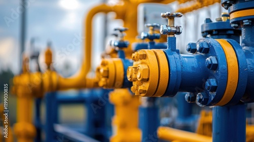 Close-up of yellow and blue industrial pipelines and valves at a gas facility against a cloudy backdrop with a focus on mechanical details
