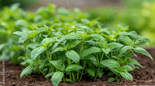 Close-up of young basil plants growing in rich garden soil, thriving in an outdoor herb garden.