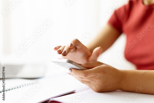 black, african american, woman, female, student, home, remote, desk, phone, smartphone, texting, typing, communication, lifestyle, hand, closeup, online, mobile, cyberspace, multitask, casual attire, tech, chat, message, learning, screen, digital, young, relaxed, sharpened, productivity, study, education, freelance, connected, working, social, contact, notebook, paper, modern, work, tied-up, writing, coordination, finger, app, cropped