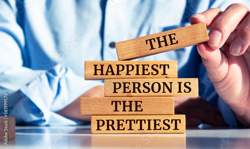 Closeup on businessman holding a wooden block with "The Happiest Person is the Prettiest" message