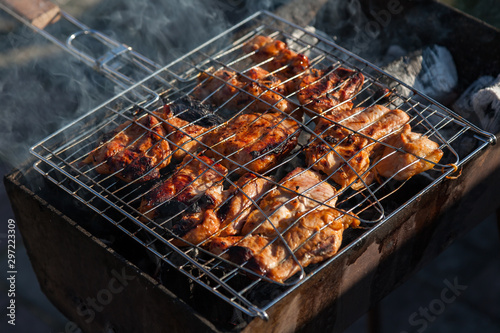Close-up on the process of cooking shashlik of pork or beef meat clamped in a grill with a crispy burnt crust over gray burnt coals on an open fire with smoke going up.