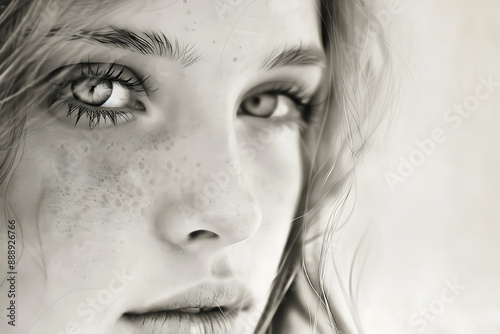 Close-up photo of a beautiful girl, capturing her radiant features and natural beauty in a detailed, expressive portrait
