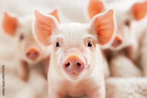 Close-up photo of cute piglets outside in a field, focusing on their expressive eyes and soft pink skin. The background is blurred to highlight the adorable young pigs.