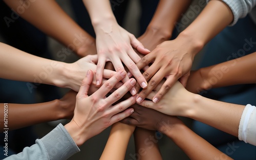 close-up photo of diverse people's hands gathered together, african american and caucasian people as one union. various ethnicities are friends all over the world. High quality