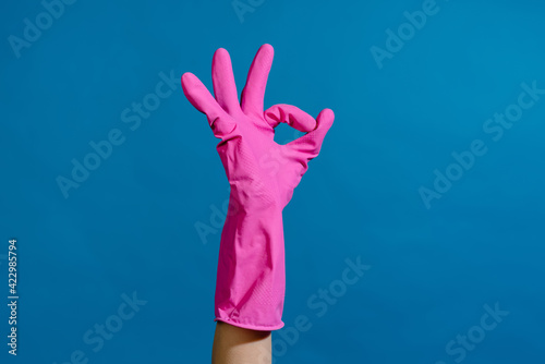 woman, adult, european, hand, glove, housework, ok, signs, gesture, indoor, studio, 1, model, people, closeup