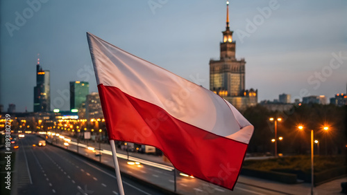 flag, poland, polish, warsaw, national, banner, patriotic, symbol, country, europa, capital, city, city landscape, light, urban, road, street, evening, night, dusk, skyline, waving, wind, motion, fabric, textile, closeup, detail, background, illuminated, glow, traffic, transportation, landmark, architecture, outdoors, travel, tour tourism, government, independence, heritage, pride, red, white, colours, dynamic, atmosphere