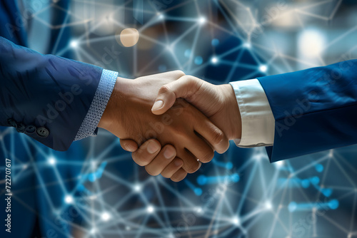 Close-up portrait capturing business professionals shaking hands in a tech office, symbolizing agreement and collaboration in a professional setting.