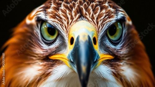 close-up portrait, majestic hawk, piercing green eyes, sharp curved beak, detailed feathers, vibrant orange and brown plumage, intense gaze, high contrast, dramatic lighting, wildlife photography, hyp