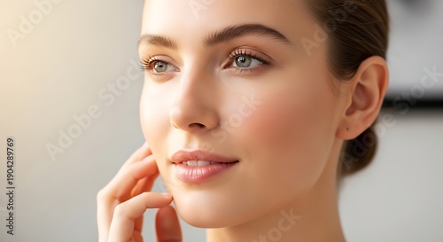 beauty, skincare, skin, woman, young, natural, healthy, glowing, face, fresh, youth, flawless, serene, portrait, closeup, natural beauty, care, wellness, well-being, dermatology, honed, confident, delicate, gentle, hand, cheek, hydratation, moisturiser, spa, treatment, lifestyle, make-up, natural makeup, clean, aglow, radiant, elegant, studio, looking away, contemplative, peaceful, pretty, head shot