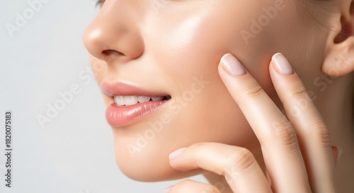 Close-up portrait of a beautiful young woman with perfect glowing skin touching her smooth cheek, showcasing a flawless complexion and beauty concept