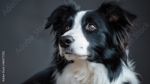 border, collie, dog, black, white, fur, portrait, closeup, eye, brown, nose, curious, alert, focused, studio, background, grey, canino, pet, animal, breed, mammal, fluffy, adorable, cute, smart, loyal, friendly, active, energetic, playful, herding, working, companion, faithful, beautiful