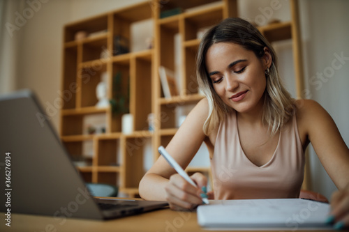 closeup, portrait, woman, girl, smiling, charming, sitting, desk, pen, writing, note, home office, home, indoor, background, entrepreneur, learning, preparation, report, exam, student, studying, concept, female, beautiful, young adult, businesswoman, relaxation, author, lifestyle
