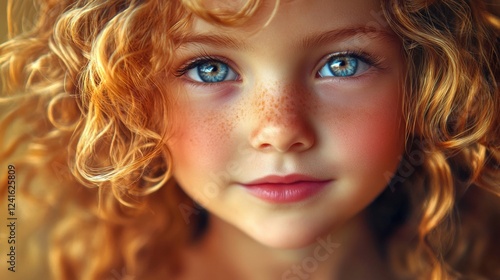cheerful, girl, curly, hair, blue, eye, freckle, portrait, closeup, warm, gold, light, background, joy, positivity, smiling, happiness, beauty, youth, children, innocence, expression, emotion, face, playful, lively, vibrant, fun, cute, natural, glow, radiant, sunny, delightful, charming, attractive, happy, admiring, lovely, serene, high-coloured, close, intimate, tenderness, captivating, excitement, engaged, joyful