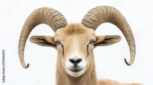 Close-up portrait of a desert bighorn sheep against white background. Possible use Stock photo