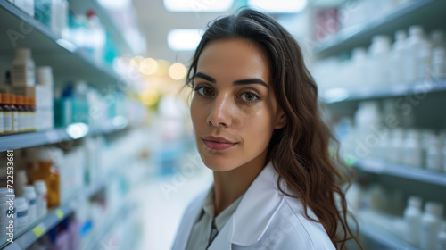 Closeup Portrait of a female pharmacist in a modern pharmacy, standing by the medication shelves and making eye contact with the camera,