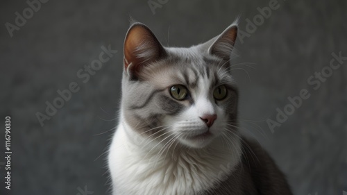 cat, felino, pet, animal, mammal, cat, kitten, domestic, grey, white, fur, eye, whisker, face, head, portrait, closeup, profile, looking, gaze, adorable, cute, lovely, beautiful, elegant, charming, graceful, peaceful, serene, calm, tranquil, soft, fluffy, smooth, sleek, paw, ear, nose, mouth, companion, friends, indoor, studio, photo, image, picture, photo