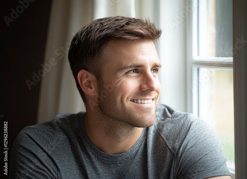 Close-up portrait of a handsome, smiling man with short hair and a beard, looking to the side with a window in the background.