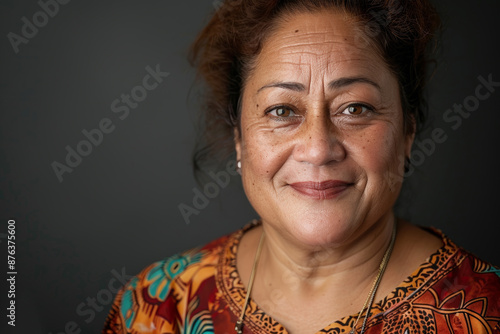 Close-up portrait of a middle aged woman of Indigenous descent, studio photo, against a sleek gray studio backdrop