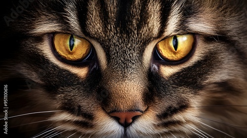 Closeup portrait of a stunning Maine Coon cat with its striking piercing eyes and tufted pointed ears The cat has a regal elegant expression and its luxurious fluffy fur creates a textured