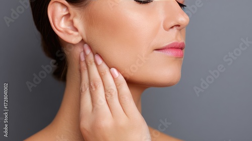 Close-Up Portrait of a Woman Gently Touching Her Jawline with a Soft Expression Against a Neutral Gray Background Showcasing Natural Beauty and Skin Care