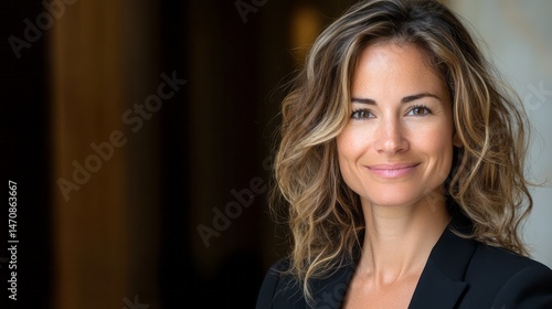 woman, portrait, smile, face, hair, eye, confident, attractive, friendly, elegant, black, jacket, business, professional, casual attire, style, beauty, natural, light, brown, curly, wavy, looking, direct, charming, pleasant, warm, happy, fashion, modern, medium, shot, sharpened, lighting, soft, studio
