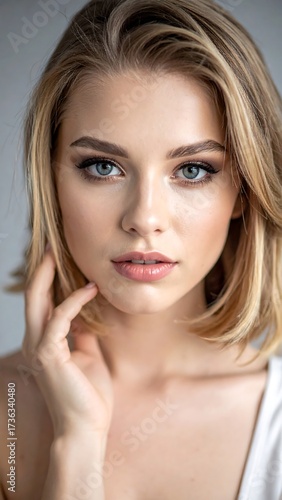 woman, blond, hair, portrait, closeup, face, make-up, beauty, style, attractive, model, eye, lip, skin, touching, elegant, charming, sophisticated, fashion, studio, light, soft, pretty, glamour, natural