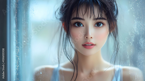 model, fashion, eye, asian, closeup, rain, aesthetic, wet hair, lip, portrait, digital photography, beauty, waterdrop, female, face, photo, woman, dreamy, artistic, window, skin, photoediting, beautiful
