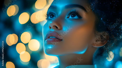 Close-up portrait of a woman's face with blue light and bokeh background.
