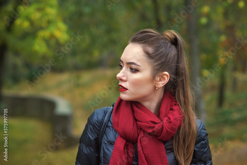 Close-up portrait of a young beautiful woman in an Autumn city Park