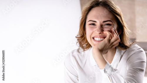 close-up portrait of a young happy smiling girl in a white shirt on a white background, copy space