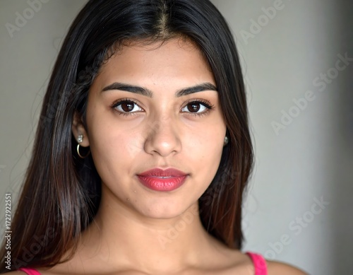 woman, young, portrait, face, serious, beauty, long hair, brown eyes, lipstick, girl, pretty, attractive, calm, confident, expression, straight, hair, make-up, closeup, toned