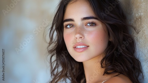 woman, girl, portrait, face, beauty, model, young, adult, female, pretty, attractive, beautiful, freckle, skin, hair, brown, wavy, curly, eye, brown eyes, smile, lip, make-up, natural, healthy, complexion, fashion, style, glamour, elegance, sensual, romantic, innocent, cheerful, confident, expression, emotion, pose, shoulder, background, wall, light, shadow, closeup, head shot, studio, summer, spring