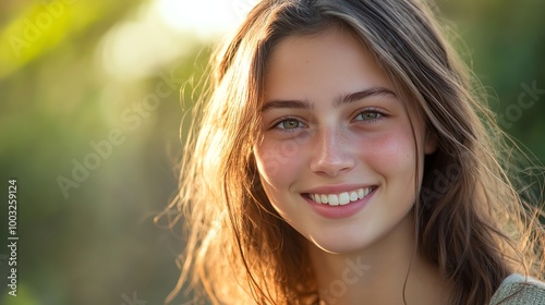 Close-up portrait of a young woman with long brown hair smiling with a natural and radiant look.