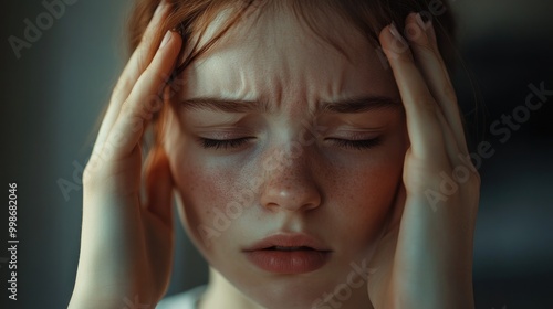Close-up portrait of a young woman with red hair, closed eyes, and freckles, holding her head in her hands, showing signs of stress or pain.